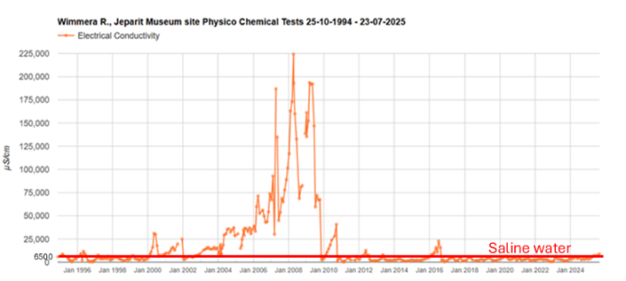 Basically the story of the River’s salinity in this time divides into four periods. The Museum site, where the River water arrives in Jeparit. The first period was in the mid-late 1990s, when the River still ran with seasonal patterns, based on fresh fallen winter and spring run-off coming quickly from the upper catchment tributaries (see first graph below). Many of the Pyrenees tributaries had dams put on them in the late 1990s, just as the Millennium Drought started. The second period was the Millennium Drought, when regular flows didn’t reach the lower catchment and the salinities soared to sea levels. The third period was short – when the heavy rainfall returned in spring 2009 and then the Jan 2011 flood. The fourth period has been for the last 15 years (see second graph below), when the River’s seasonal pattern has returned and, with the aid of environmental flows when needed, the water quality has not reached saline levels most of the time. Focussing on the last decade at this site, salinity had settled down to a fairly regular seasonal pattern, similar to that of the 1990s, until April this year, when the impact of drought and reduced flows has again raised levels to saline water quality, now up to 9000 us/cm ECs.